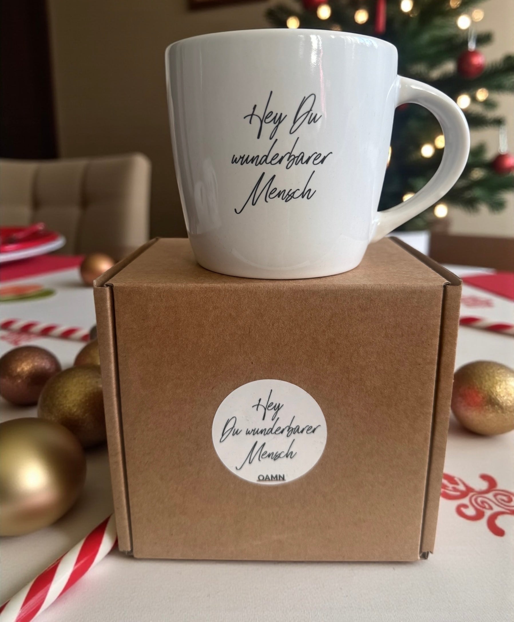 Geschenkidee für die Weihnachtszeit: Tasse "Hey du wunderbarer Mensch" mit Geschenkschachtel